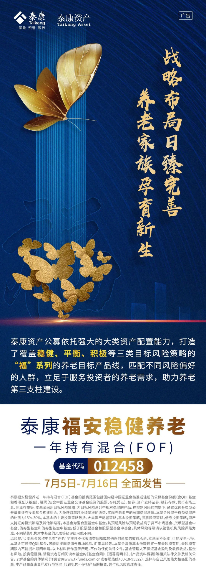 本基金名称中含有“养老”字样并不代表收益保障或其他任何形式的收益承诺,本基金不保本,可能发生亏损。本基金可投资QDII基金,可能间接面临海外市场风险、汇率风险等。本基金每份基金份额设置一年最短持有期,最短持有期限内不能提出赎回申请。以上材料仅作宣传所用,不作为任何法律文件。基金管理人不保证基金盈利及最低收益,基金有风险,投资需谨慎。请投资者仔细阅读本基金的《基金合同》、《招募说明书》、《产品资料概要》等相关法律文件及相关公告,了解基金的具体情况(详见官网www.tkfunds.com.cn或客服热线400-18-95522),选择与自己风险能力相匹配的基金。本产品由泰康资产发行与管理,代销机构不承担产品的投资、兑付和风险管理责任。