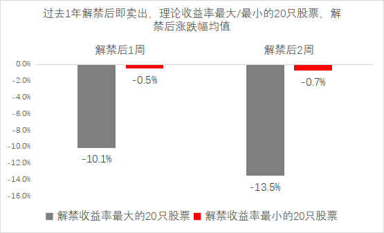 过去1年,解禁后如即卖出,那理论上收益最大的前20只股票,解禁后1周、2周分别下跌10.1%和13.5%;