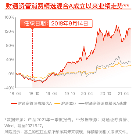其管理的财通资管消费精选混合(005682)中长期表现亮眼,聚焦“大消费”领域,成立以来至2021年一季度末,A类份额累计回报94.87%,相比业绩基准超额收益达73.67%*。银河数据显示,截至6.18,财通资管消费精选A近2年收益率在同类基金中位居前25%。