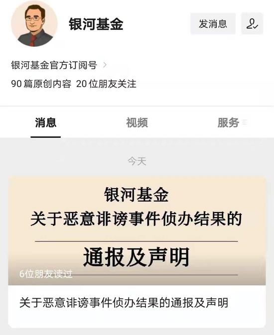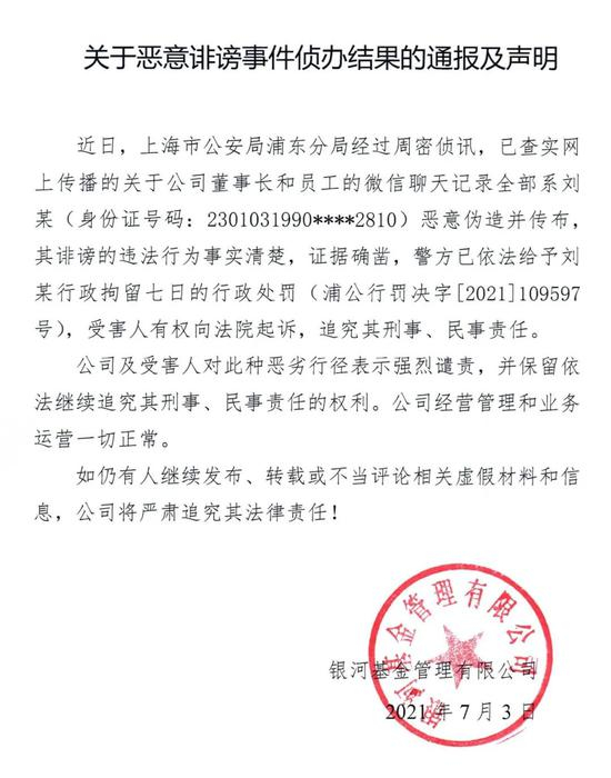 银河基金在官方微信公众号中,发布了银河基金关于恶意诽谤事件侦办结果的通报及声明:关于公司董事长与员工的微信聊天记录全部系刘某恶意伪造并传布,其诽谤的违法行为事实清楚,证据确凿,警方已依法给予刘某行政拘留七日的行政处罚。详情如下: