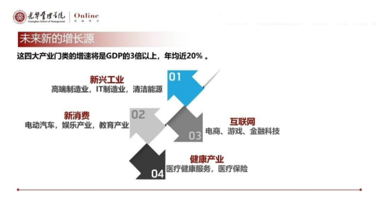 未来5-10年,甚至更长的时间周期里,中国经济新的增长极将来自四大产业门类,它们的增速会是GDP的3倍以上,年均近20%,这四大产业门类分别是新兴工业、新消费、互联网和健康产业。