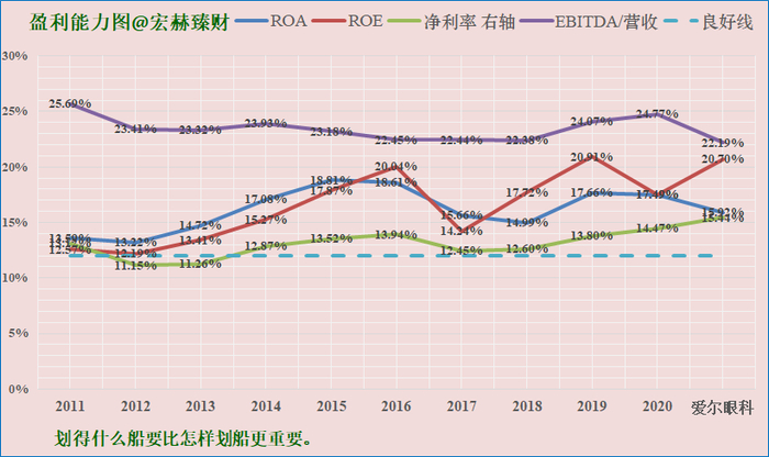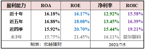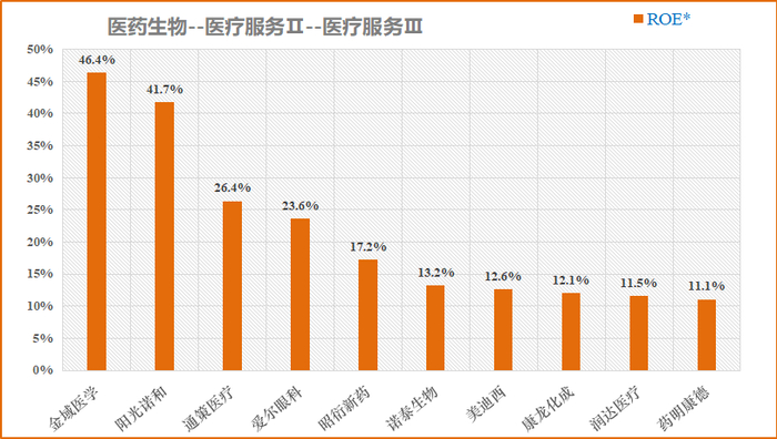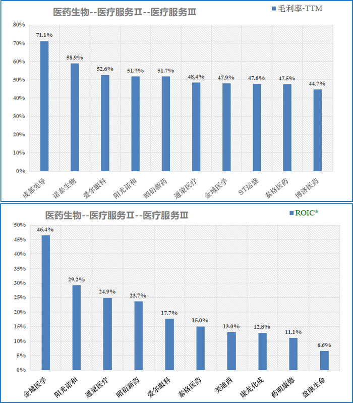 爱尔眼科毛利率52.6%,排名3/27;ROIC*17.7%,排名第5;ROE*23.6%,排名第4。