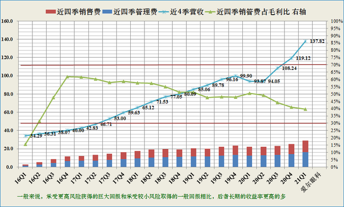 投资者可关注近四季销售和管理费用与毛利润之比持续小于30%的公司(绿线低于下红线为优异,靠近为优秀),具备较高的竞争优势,若30-70%之间为可接受区域(图中红色直线之间),若大于70%需要警惕,说明该公司产生净利润的能力较弱。