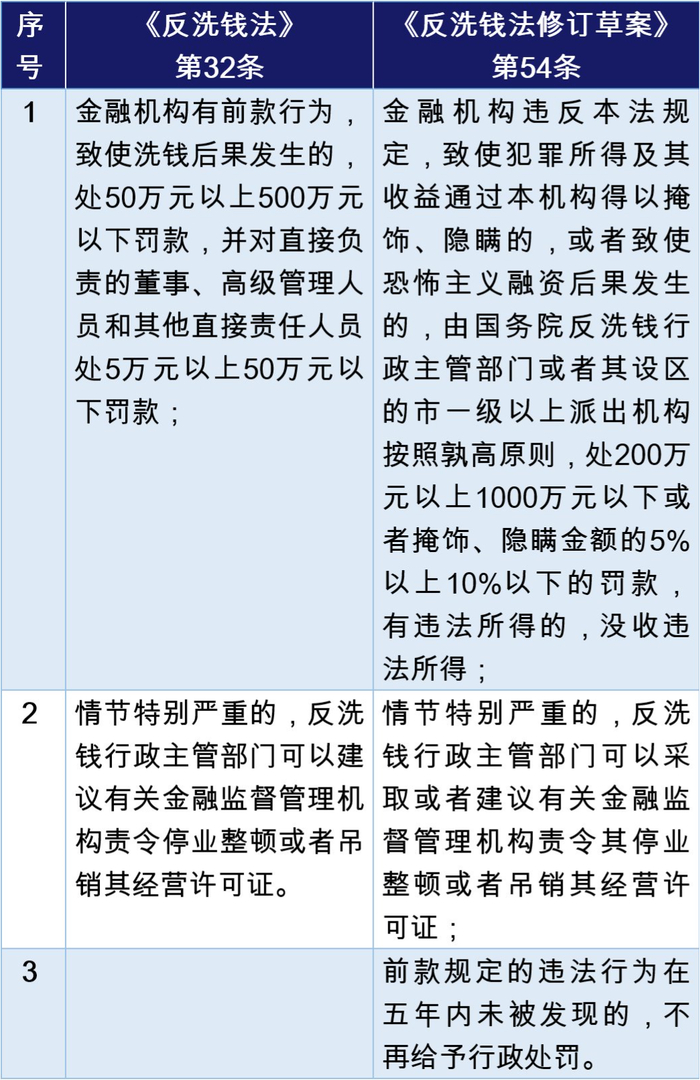 《反洗钱法修订草案》对于金融机构及其有责任的董事、监事、高级管理人员的行政罚款金额明显都要高于《反洗钱法》。如将对洗钱结果发生负有责任的董监高的行政罚款,由5万-50万人民币的区间,大幅提高到了20万-100万人民币的区间,且可没收违法所得并可建议金融监管机构取消其任职资格、禁止其从事金融工作。