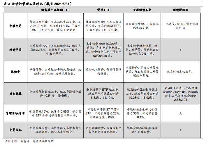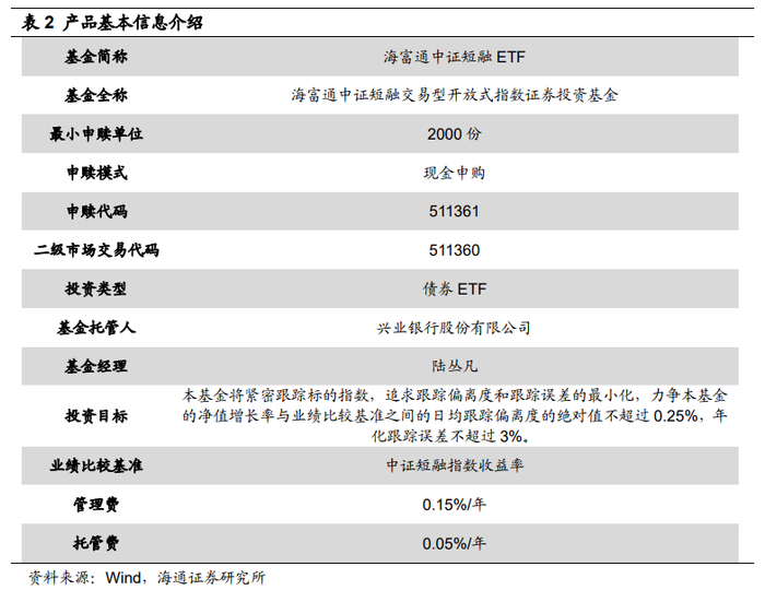 我们将海富通中证短融ETF与货币ETF、普通短债基金、国债逆回购流动性管理工具进行对比,发现:1)短融ETF申赎交易的资金流转效率最高,进出较为灵活;2)短融ETF所投债券的期限略长于货币ETF,但短于普通短债基金,国债逆回购的期限大都是标准日期。因此,短融ETF的流动性较为充沛;3)从波动率来看,由于短融ETF被动跟踪中证短融指数,波动率相对可控,且低于普通短债基金,这一点我们在指数分析部分也已印证过。由于货币ETF采取摊余成本法计价,理论上每日收益为正,波动率低于短融ETF和普通短债基金。4)从历史收益来看,中证短融指数业绩良好。5)短融ETF的费率低于货币ETF和普通短债基金,而且无申赎费,部分场内交易券商还可免除佣金,投资成本较低。