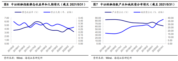 随着短融市场的扩容,中证短融指数的成分券数量从2015年底的1876只增加至2020年底的2022只,数量稳步抬升。从简单平均静态收益率来看,中证短融指数的静态收益率在2017年底到达最近几年的峰值,数值为5.91%。随着流动性逐步宽松,中证短融指数的平均静态收益稳定在3%-4%之间,而久期一直稳定在0.3-0.4年之间(多数在120天附近),有轻微的缩短趋势。从券种分布来看,中证短融指数成分券以产业债居多,但是最近几年,产业债占比由80%下滑至60%,城投债占比在逐步抬升。