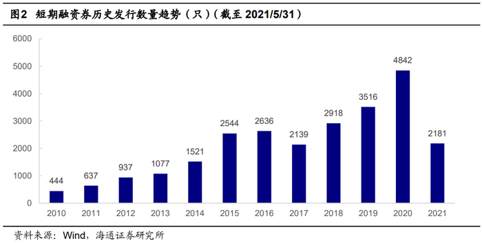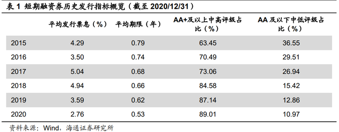 从数量来看,2012年短融发行数量仅为937只,而2020年发行量增加至4842只,增幅超过5倍,成为债券市场不可或缺的重要品种,占债市整体发行比例约10%。具体来看,最近五年超短期融资券(期限不超过270天)发行数量占比超7成,剩下为一般短期融资券。