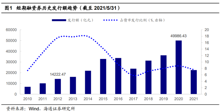 自人民银行2005年推出短期融资券以来,短融市场愈加壮大,数量和规模都得到了跨越式的发展。特别地,银行间市场交易商协会于2012年6月通知,凡公开市场评级在AA(含)以上的发行人,将不区分企业性质,允许其短期融资券、中期票据发行额度互不占用。这意味着,该类发行人的短期融资券(包含超短融)的发行额度将不受债券余额不超过净资产40%的限制,此后短融发行规模大幅增加。值得注意的是,2012年短融发行额合计14222.47亿元,2020年短融发行规模上升至49986.43亿元,增幅超过3倍并且创下历史新高。