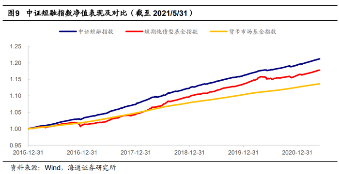 分年度来看,除2018年外,中证短融指数基本都跑赢了短期纯债型基金指数和货币市场基金指数,且最近三年和五年的年化波动率均介于后两者之间。回溯历史,我们发现中证短融指数在风险调整后收益方面表现良好。另外,我们还测算了自2016年1月1日以来(截止2021年5月31日),中证短融指数、短期纯债型基金指数、货币市场基金指数日收益率为正的比例分别是88.29%、80.15%、100%,进一步表明中证短融指数的盈利概率较高。