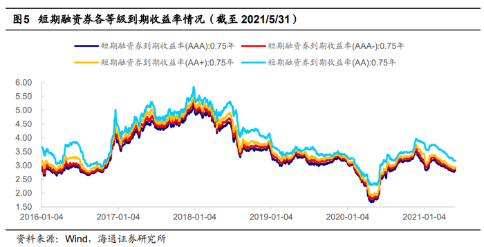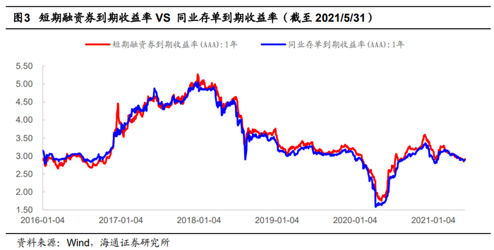 自2016年以来,短融到期收益率受利率中枢整体下行影响,到期收益率行至历史较低水平,但是仍然高于同期限同等级的同业存单到期收益率,大约有5-6bp的领先差距。
