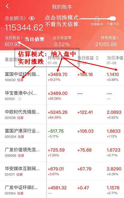 可以盘中实时查看持仓基金当日涨跌幅。(图中数据均为虚拟数据)。也可以点击“不看今日”切换至真实模式,只查看昨日的真实数据。