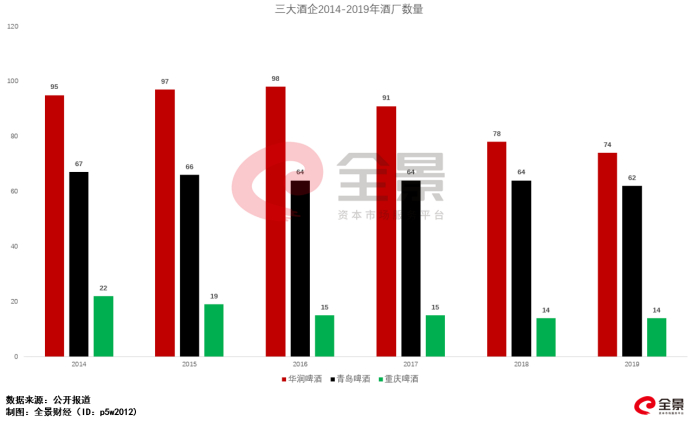 近年来,先是嘉士伯入主后重庆啤酒率开始去产能,2015、2016年分别减少3、4家生产厂;华润啤酒则在2017年开始去产能,2017-2019年共计关闭24间啤酒厂;青岛啤酒去产能开始较早,但节奏相对缓慢,2015-2019年共关闭5间啤酒厂。