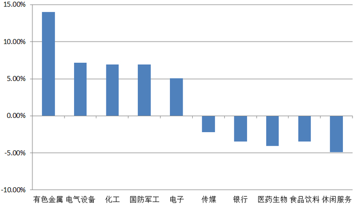 申万28个行业涨跌互现,其中有色金属、电气设备、化工涨幅居前,国防军工和电子紧随其后,休闲服务、食品饮料跌幅居前。