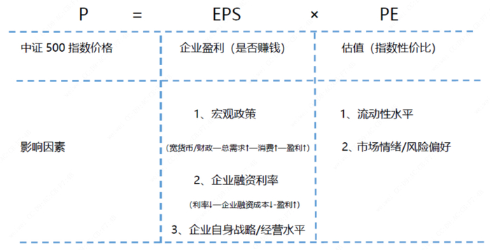 因为指数都是由一篮子成分股构成的,所以指数的定价也可以遵循这样的逻辑,即中证500指数的价格P=EPS(成分股每股盈利)×PE(指数市盈率),那么我们要来分析中证500指数贵不贵其实就是分析这三者之间的关系。