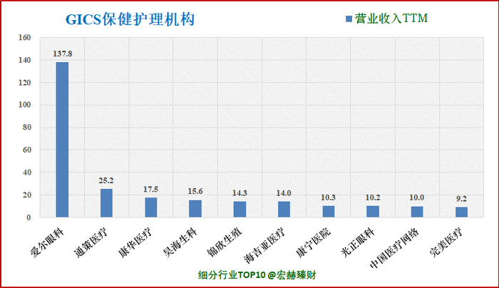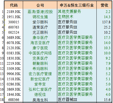 中股营收TOP3为:爱尔眼科137.8亿、通策医疗25.2亿、康华医疗17.5亿人民币。