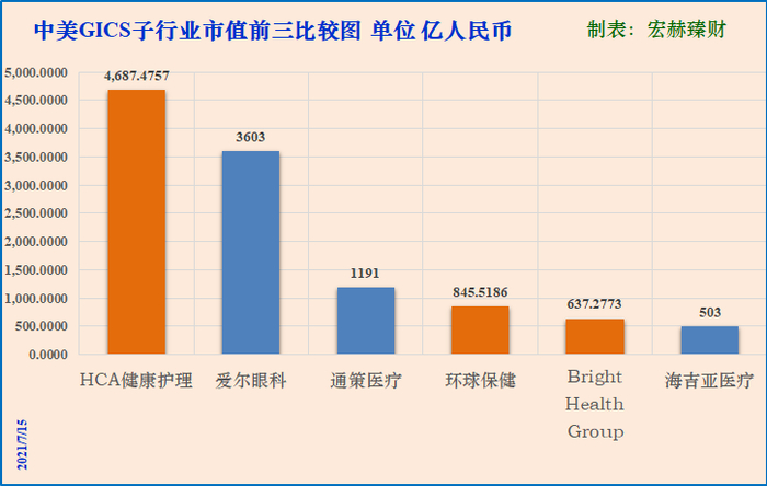 美股市值前三:HCA健康护理4687亿、环球保健846亿、Bright Health Group637亿人民币。