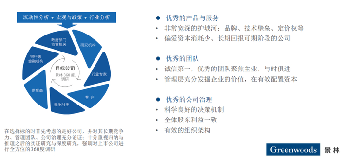 景林资产拥有跨市场投资经验,全球布局——投资港股、A股和美股,并在香港、上海和新加坡三地设有办公室。(上海景林资产管理有限公司为中国境内私募基金管理人,景林旗下另有中国香港和新加坡的主体,受当地监管机构监管) 研究团队分为消费、TMT、医药、周期及非中国资产五个大组,人员教育背景优秀,且在各自研究领域拥有多年实业经验。投资策略上坚持价值投资,在深入研究的基础上,坚守优质龙头企业并赚取企业盈利增长的收益。公司的价值取决于企业基本面,如果上市公司业务模式好、进入壁垒高、增长快、股价相比估值模型被低估,就会坚决买入持有。