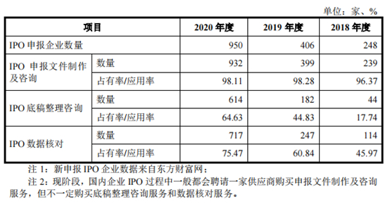 虽然价格不菲,但如下图所示,荣大科技相关业务的市场占有率却在逐年增加。2020年,在全年申报上市的950家企业中,采购了荣大科技IPO申报文件制作和咨询、IPO底稿整理咨询、IPO数据核对服务的公司分别为932家、614家和717家,市占率高达98.11%、64.63%和75.47%。