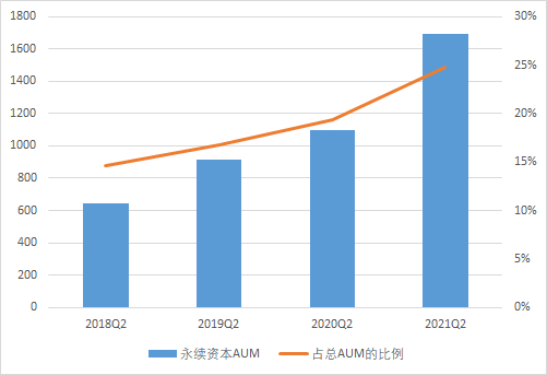 在二季报中,还有一个数字值得重点关注,那就是黑石的永续资本规模大增了55%,达到1695亿美元,已经占到总资产管理规模的四分之一。实际上,黑石二季度的AUM和管理费的增长绝大部分来自永续资本。