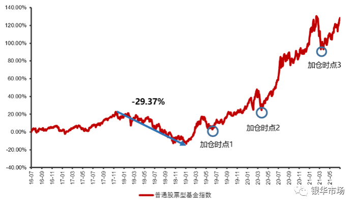指数最大回撤数据来源:Wind,2021.6.30。加仓时点1前期下跌幅度为12.39%,时间区间2019.4.4-2019.6.6;加仓时点2前期下跌幅度为15.72%,时间区间为2020.2.25-2020.3.23;加仓时点3前期下跌幅度为16.19%,时间区间为2021.2.10-2021.3.9。