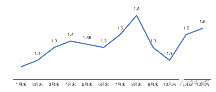 最大回撤是指在选定周期内任一历史时点往后推,产品净值走到最低点时的收益率回撤幅度的最大值。简单来说就是过去某一段时间内基金最大的跌幅。假设某基金一年内的净值走势如下图,总共经历了两次下跌。从4月末的1.4元下跌到6月末的1.3元,跌幅为7.14%。在8月末净值回升至1.8元,随后再次下跌到10月末的1.1元,此次跌幅38.89%。那么这一年该基金的最大回撤为38.89%。