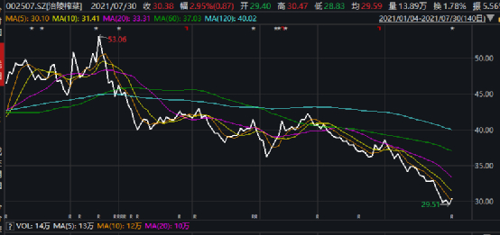 当时,涪陵榨菜的定增价格为33.58元/股。然而截至7月末,股价已经跌至30.38元/股,跌幅超过10%,今年以来跌超28%,目前股价较52周高位56.24元/股近乎腰斩。