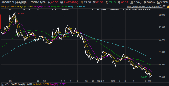 但自2020年9月公司股价攀至高点后,便开始跌跌不休。截至7月30日,中炬高新年内跌幅已经扩大至44.3%,较52周最高价82.15元/股,已经腰斩。目前,最新收盘价为36.58元/股,总市值为291亿元。