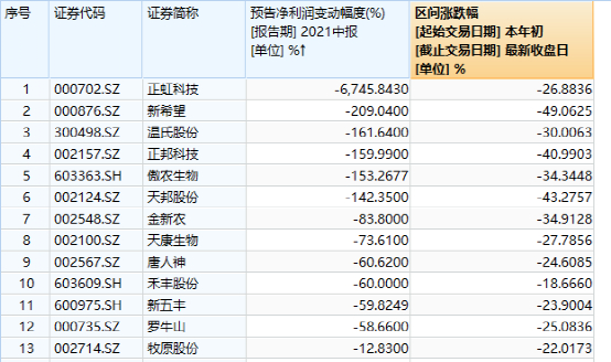 年初至7月末,牧原股份、温氏股份、新希望和正邦科技股价累计下跌22.02%、30.01%、49.06%和40.99%。