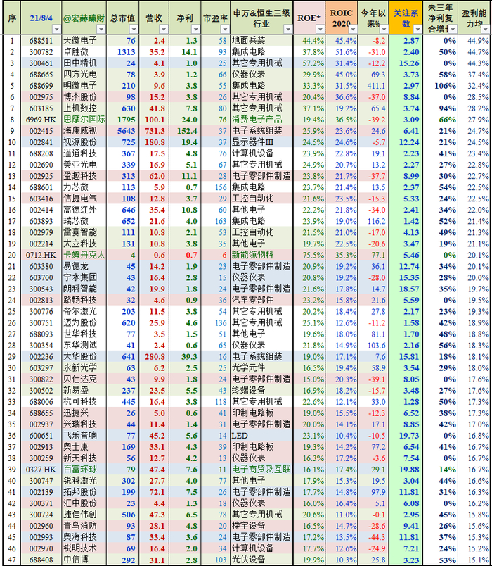 注:市值、营收规模过小公司请谨慎对待。有些新股没有ROIC数据。若时效久远,请联系honghe918微信定制最新时点表格。新股要注重盈利能力是否在融资后可持续。