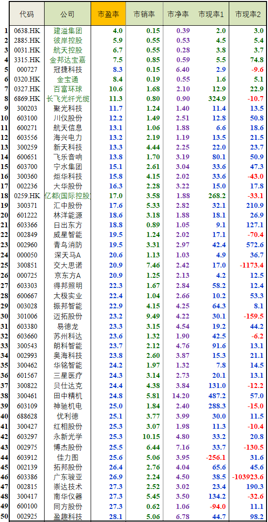 市盈率升序表Top50