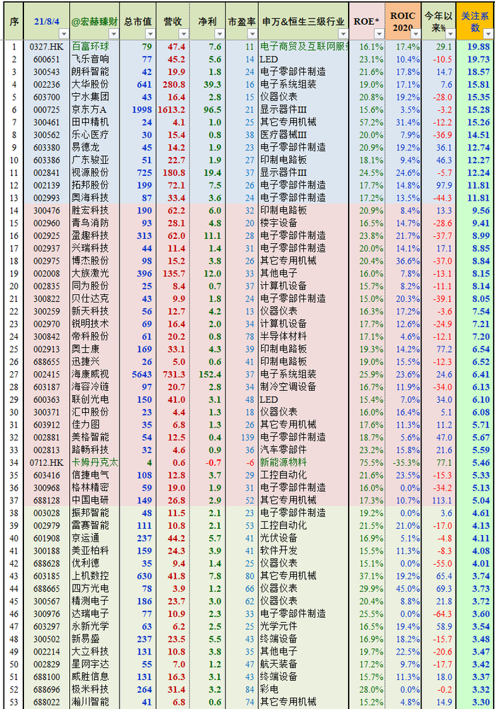 关注系数测评日期:21/08/04;关注系数参考价值只和当前时点相关。若间隔久远,请定制【宏赫行业优选】(联系微信号:honghe918)后台输入“关注系数”提取详细介绍。