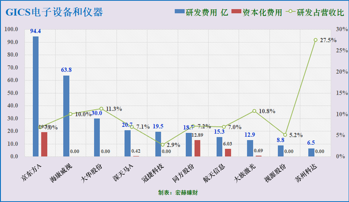 研发投入三甲:京东方-A94.4亿、海康威视63.8亿、大华股份30.0亿。