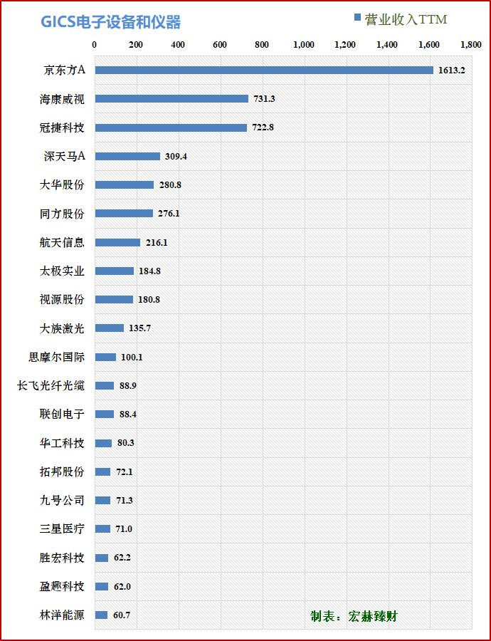 中股营收TOP3为:京东方A1613.2亿、海康威视731.3亿、冠捷科技722.8亿人民币。