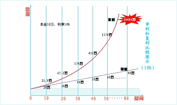 例子1:假如你每年能赚取6%的回报,若你投入10万元,几年后能得到20万呢?可以简单计算为72/6=12年。即若复利收益率为6%,12年可翻倍。