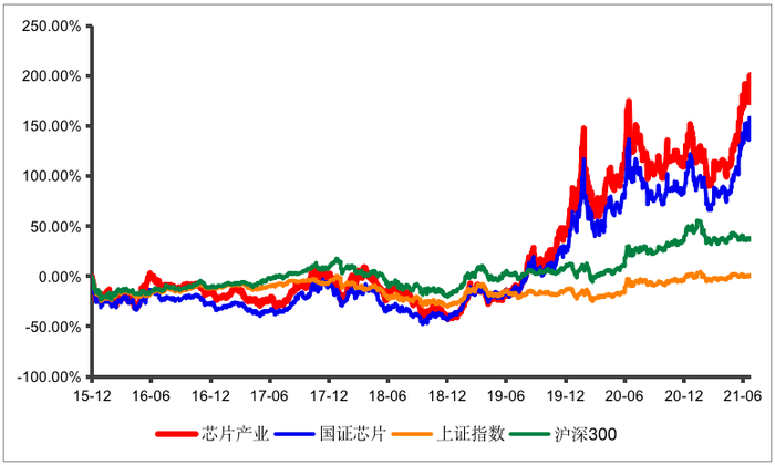 中证芯片产业指数以2015年12月31日为基期,截至2021年7月25日,自基日以来总回报达到200.92%,同期沪深300指数总回报为35.17%;近两年超额收益扩大,芯片产业指数上涨244.06%,同期沪深300仅上涨33.23%,超额收益高达210.82%。