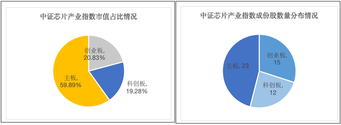 指数成份股以科创板和创业板为重要组成部分,截至2021年8月9日,中证芯片指数50只成份股中,科创板占12只、创业板达15只,总占比超54%,主板占23只;从市值占比来看,中证芯片产业指数总市值达28800亿元,其中主板总市值为17249亿元,市值占比近60%,科创板、创业板分别为5551亿元、6000亿元,市值占比分别为19%、21%。