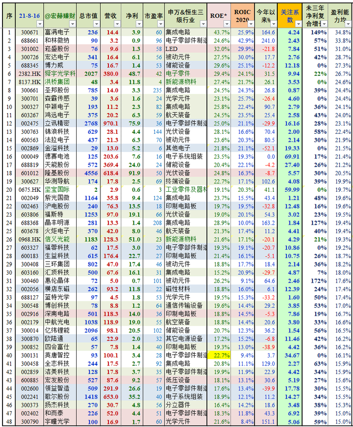 注:市值、营收规模过小公司请谨慎对待。有些新股没有ROIC数据。若时效久远,请联系honghe918微信定制最新时点表格。新股要注重盈利能力是否在融资后可持续。