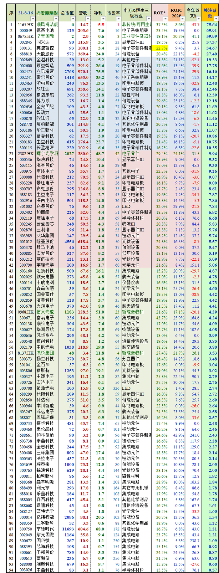 宏赫量化选公司步骤1:上述240家企业剔除未来三年机构一致预期ROE总均值小于15%的企业(港股采用roe-ttm);然后按照宏赫关注系数降序排列如下(并剔除关注系数异常值的公司),初选1胜出公司【94】家。