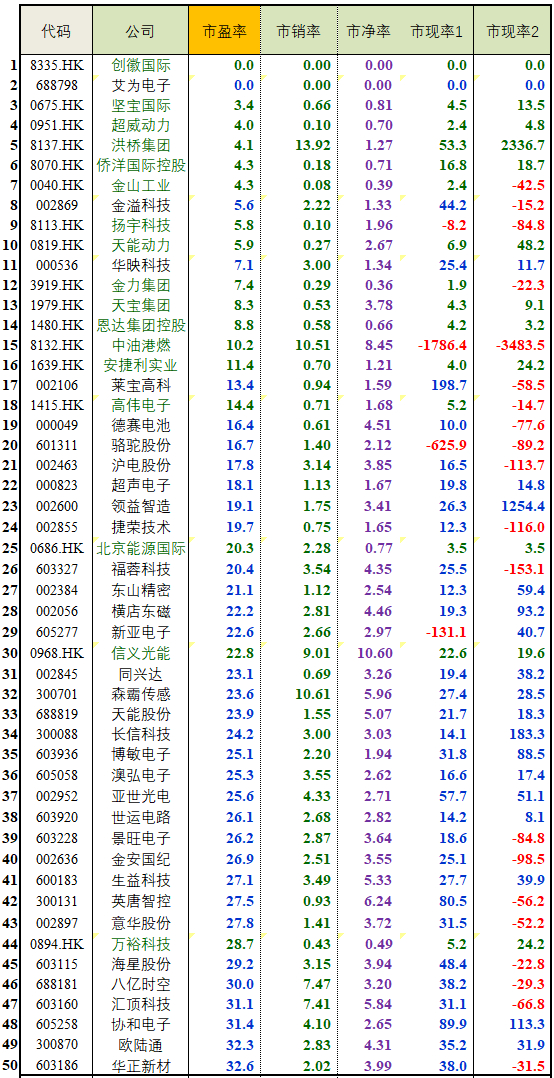 市盈率升序表Top50
