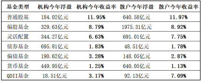 要对比两类资金到底谁选基金能力更强一些,还是应该每类基金来对比,为此,笔者通过第三方数据做了今年以来的计算: