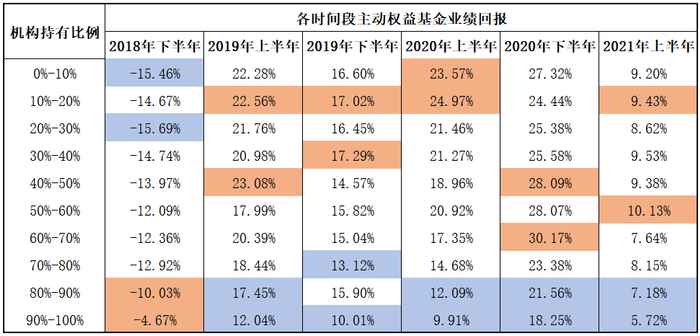 表格涉及到的因素比较多,再举例说明一下,左上角的-15.46%意味着机构持有比例在10%的主动权益基金在2018年下半年的平均收益率是-15.46%。为了对比方便,上图把业绩最好的两组基金标为橙色,业绩最差的两组基金标为蓝色。