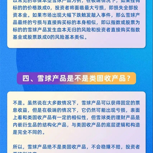 (一)千万不能将雪球产品与固定收益产品画上等号,更不能理解为是“稳赚不赔”的金融产品。雪球产品是有一定概率产生较大本金损失的一种产品。