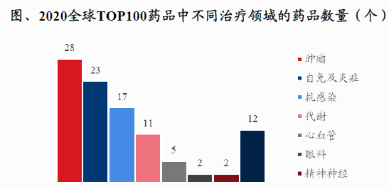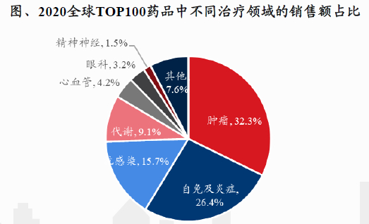 2020年全球销售额TOP100药品的合计销售规模约3558亿美元,自身免疫及炎症药物位列第2(约940亿美元,占比26.4%)。