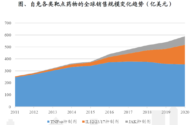 图:自免各类靶点药物的全球销售规模(亿美元)