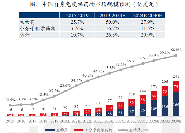 中国自身免疫市场仍处在发展阶段,国内获批用药较少,但在临床阶段药品较多,未来2-3年将持续获批产品上市;预计整体市场规模从2019年的24亿美元增至2030年的241亿美元,2019-2024年CAGR 26.3%,2024-2030年CAGR 为20.9%,其中生物药市场预期将从2019年的的5亿美元增至2030年的166亿美元,2019-2024年CAGR50.0%,2024-2030年CAGR 27.9%,市场份额从2019年的22.7%增至2030年的68.8%。