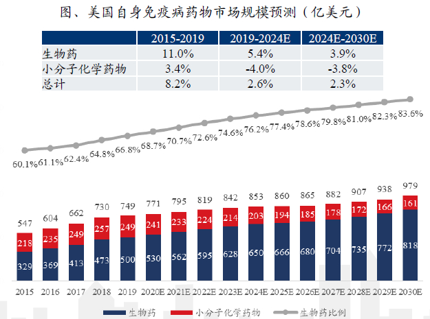 美国自身免疫性疾病药物市场预期将由2019年的749亿美元增至2030年的979亿美元。美国自身免疫性疾病市场中,生物药的市场份额占比较高,但其占比仍将持续提升,预期将由2019年的66.8%增至2030年的83.6%。