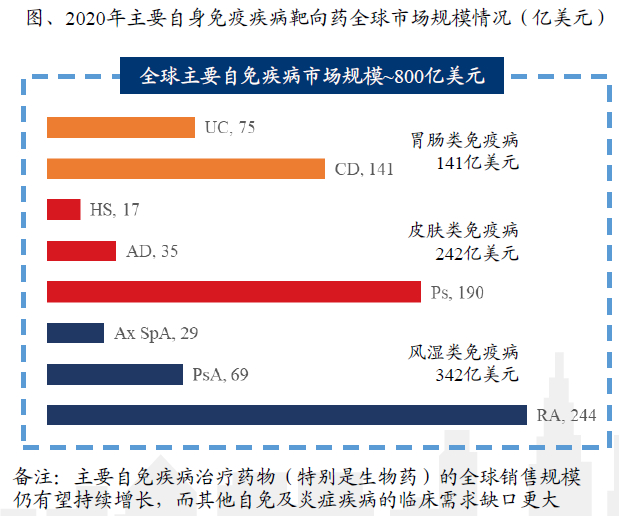 目前全球主要自免疾病市场可分为风湿、皮肤、胃肠等三类,其中类风湿性关节炎(RA)、银屑病(PS)、克罗恩病(CD)治疗领域单一市场均已超过100亿美元,但各类自免及炎症疾病仍存在大量的未被满足的临床需求。