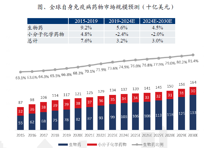 根据弗若斯特莎莉文数据显示:全球自身免疫性疾病药物市场预期将由2019年的1169亿美元增加至2030年的1638亿美元。全球自身免疫性疾病市场中,主要以生物药为主,且生物药比例仍在逐渐提升,生物药的市场份额预期将由2019年的66.8%增加至2030年的81.4%。