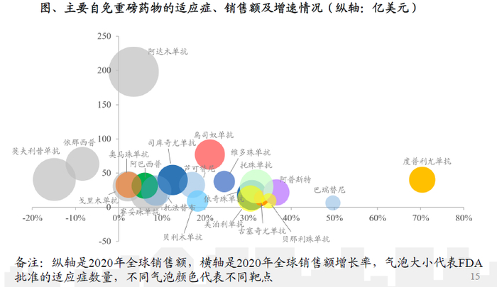 图:主要自免重磅药物的适应症、销售额及增速(亿美元)