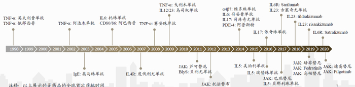 从具体产品来看,2020年5款TNF-α抑制剂销售额增长呈现疲软态势,而古塞奇尤单抗(IL23p19)、依奇珠单抗(IL17)、美泊利单抗(IL5)、贝那利珠单抗(IL5)、托珠单抗(IL6)、阿普斯特(PDE-4)等品种保持疲软阿达木单抗、2020年销售额保持32%左右增长率,度普利尤单抗(IL4/13)凭借适应症持续拓展,实现70%以上的高速增长,而瑞莎珠单抗(IL23p19)、乌帕替尼(JAK1)等2019年新上市产品凭借优异的疗效呈现爆发式增长,分别实现15.9亿美元、7.31亿美元的全球销售额。